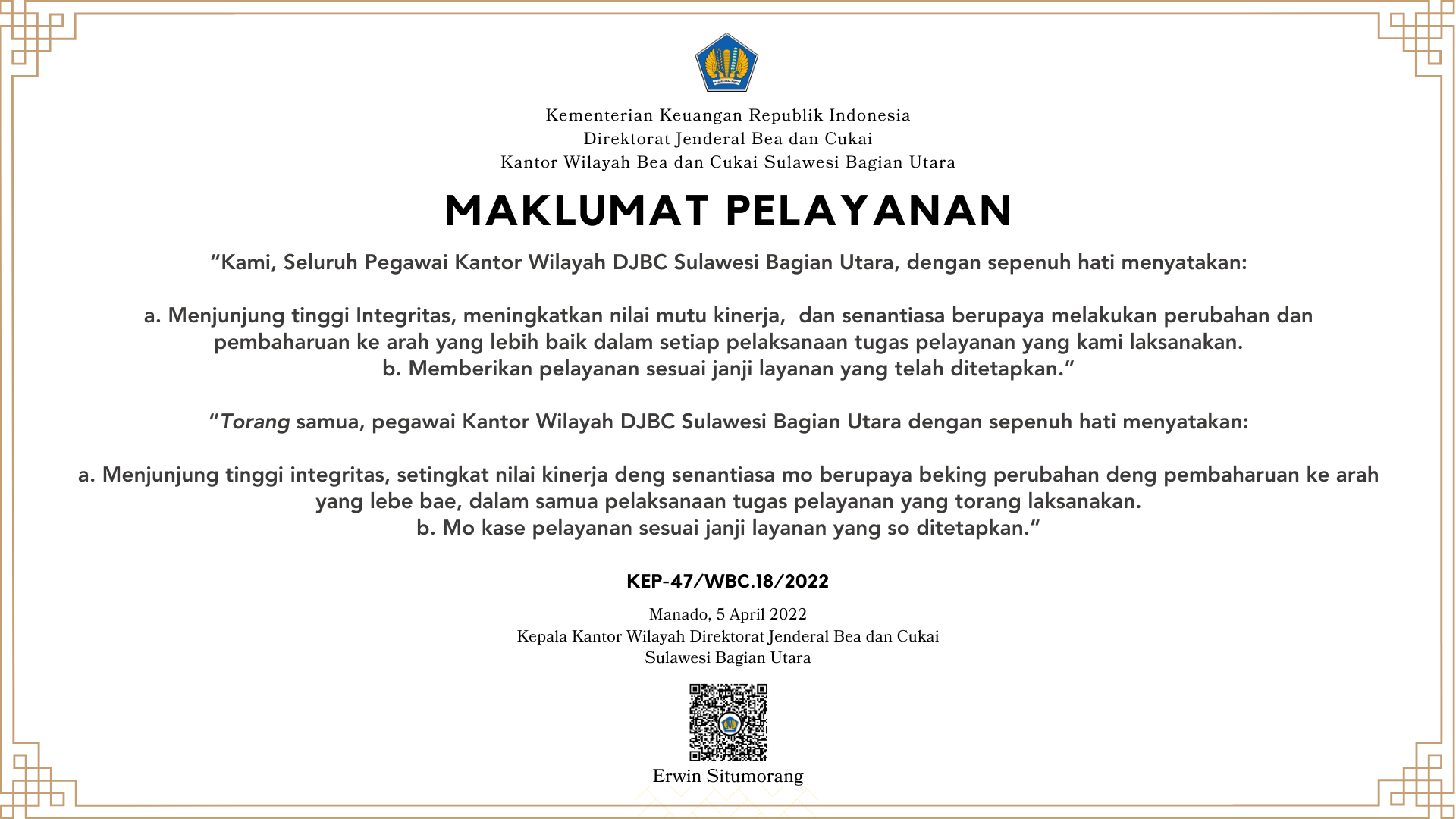Manado, 28 Agustus 2024– Dalam upaya mensosialisasikan budaya anti-korupsi serta memberikan apresiasi kepada para pengguna jasa dan pemangku kepentin...